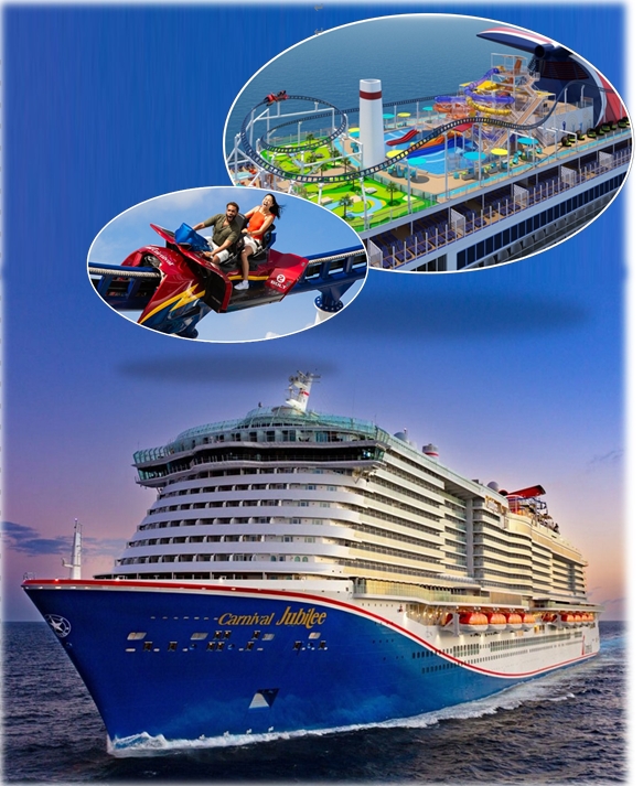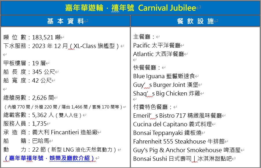 嘉年華遊輪為全球最大遊輪集團之一,旗下以「Fun Ship」為核心品牌精神,強調熱情、活力與全齡同樂的度假體驗,深受家庭旅客與年輕族群喜愛。Carnival Jubilee 於2023年底全新下水,為嘉年華遊輪 Excel Class 系列第三艘旗艦級新船,設計與娛樂規模再升級。船上擁有世界首創的海上雲霄飛車「BOLT」,讓旅客在高空中俯瞰壯闊海景;多主題水上樂園與家庭專屬娛樂區,滿足親子與團體旅遊需求。餐飲選擇豐富多元,包含廣受好評的 Guy’s Burger Joint、BlueIguana Cantina 等特色餐廳,結合劇院級表演、派對活動與夜生活空間,打造從早到晚都精彩不間斷的海上歡樂體驗。