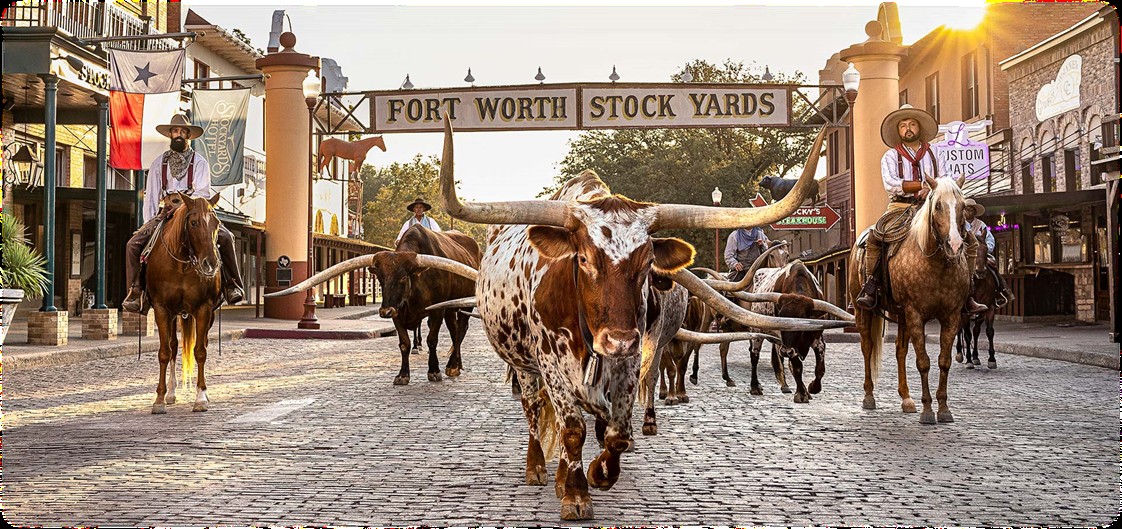 沃斯堡畜牧場 是體驗德州牛仔文化的經典地標,完整保留19世紀末牧牛與鐵路運輸的歷史風貌,街道兩旁的紅磚建築、木造酒吧與特色商店,彷彿帶領旅人走進西部拓荒年代。每日定時上演的牛群趕集,重現當年牧牛進城的壯觀場景,成為最具代表性的畫面,園區內亦設有博物館、表演場與餐廳,從牛仔文化、牧場歷史到現代娛樂一應俱全,無論是拍照、漫步或欣賞表演,皆能感受濃厚且熱情的德州西部精神。