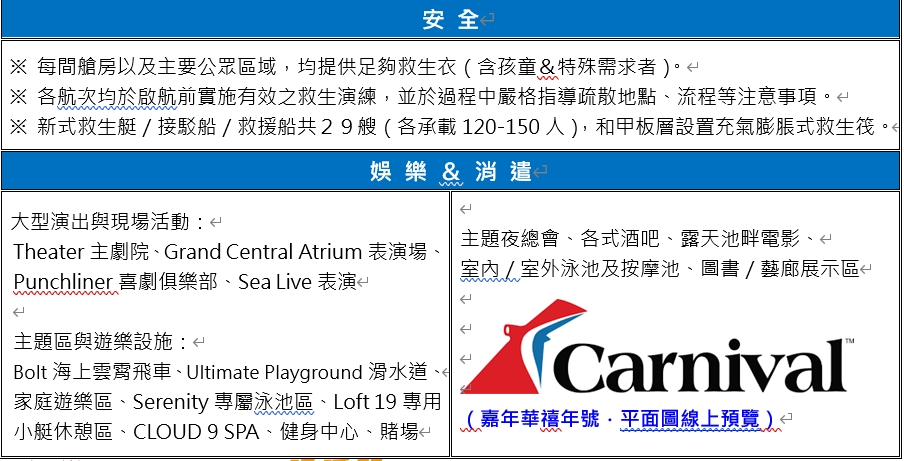 嘉年華遊輪Carnival Cruise Line是全球最受歡迎的休閒遊輪,自1972年創立以來,一直專注於打造「Fun Ship」概念,將親友歡樂與輕鬆氛圍帶入航海假期,營運了超過29艘遊輪,航線涵蓋加勒比海、墨西哥、阿拉斯加、歐洲與亞洲,船上設有多樣化的娛樂設施,如水上滑道、舞台演出、夜間派對、賭場等,適合全家出遊,客艙從經濟房型到陽台套房應有盡有,適合全家及三五好友一同出遊,是全球遊輪市場上結合歡樂與創新的領導品牌。