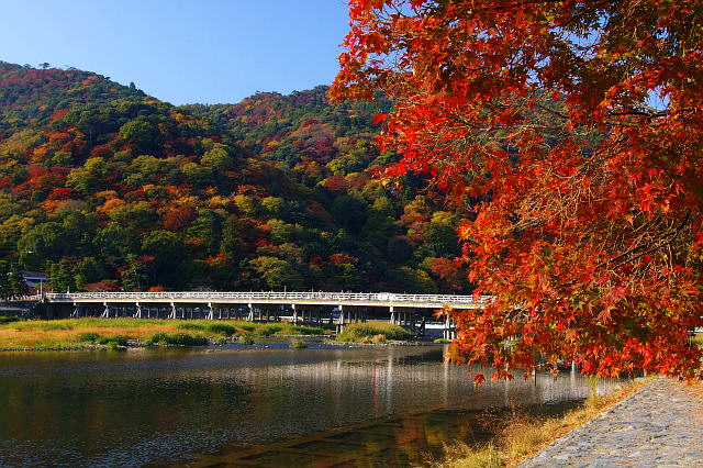 【嵐山】也是不能錯過的賞楓熱點之一!位於京都西部的,秋季的嵐山可以看到山坡和河岸都被紅葉裝點得如詩如畫。特別是渡月橋附近,紅黃色交疊在一起的楓葉映照在桂川水面上,景色十分迷人。